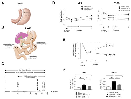 (A) Vertical sleeve gastrectomy (VSG) procedure used. (B) Roux-en-Y gastric bypass (RYGB) procedure used. (C) Time-course of the experiment. (D) Evolution of body weight after surgery. (E) Evolution of body weight loss after surgery. (F) Fat mass at the end of the experiment. Sham-operated lean controls (Sham-L); sham-operated obese controls (Sham-DIO); obese mice that underwent a vertical sleeve gastrectomy (VSG-DIO) or a Roux-en-Y gastric bypass (RYGB-DIO). Mean ± SEM, Wilcoxon and Mann–Whitney tests: ** p < 0.01, *** p < 0.001. Std—standard laboratory chow; HFD—high fat diet; DIO—diet-induced obesity.