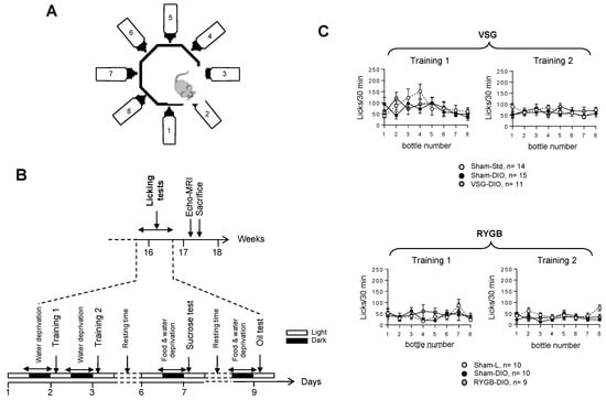 Le Roux et al. found no difference in the IntralipidTM lick scores between RYGB rats and sham-operated controls [22], while Shin et al. reported an improvement in the licking responses to corn oil after RYGB [16]. Finally, although the VSG is also associated with healthier changes in the food selection in rats [23,24,25], the potential impact of this bariatric procedure on the orosensory perception of fat and sweet stimuli is unknown.