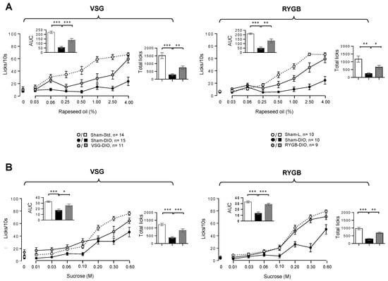 In Sham-L (VSG or RYGB) mice, the licking activity showed a typical dose–response curve to growing concentrations of oily emulsion (Figure 3A) and sucrose solution (Figure 3B). As previously observed [16], the licking rates decreased dramatically in Sham-DIO mice (VSG or RYGB) as compared to the lean controls (Sham-L), confirming that obese animals are unable to perceive properly fat and sweet stimuli. By contrast, DIO mice that have undergone VSG or RYGB displayed a greater licking activity than their respective obese controls (Sham-DIO). This sensory improvement was substantial, as pointed out by the comparison of both the area under curves (AUC, inserts Figure 3) and the total licks number during the 30 min session. However, this correction was partial, as the licking rates of VSG and RYGB mice remained lower than those found in their respective lean controls (Sham-L).