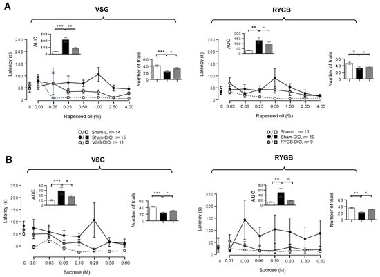 Motivational components of the taste-driven responses to oily emulsion and sucrose solution in sham-operated lean (Sham-L) and obese (Sham-DIO) controls and in obese mice that underwent a vertical sleeve gastrectomy (VSG-DIO) or a Roux-en-Y gastric bypass (RYGB-DIO). Latency is the time between the presentation of a bottle and the initiation of the first lick and the number of trials is the number of solutions licked during the 30 min taste-testing session. (A) Oily solutions. (B) Sucrose solutions. Zero on the X-axis represents the licking rate in response to the control solution without oil or sucrose. Analysis of both areas under curves (AUC, Inserts) and a number of trials during the 30 min of taste-testing sessions was performed using the Sham-DIO group as reference. Mean ± SEM. ns—non-significant, * p < 0.05, ** p < 0.01, *** p < 0.001. DIO—diet-induced obesity.
