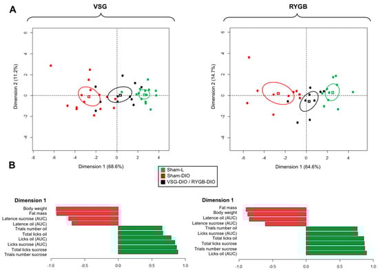 To gain insight into the impacts of the VSG and RYGB procedures in this animal model, a multivariate analysis (principal component analysis—PCA) was performed. The values on the x- and y-axes, describing, respectively, the component score for the dimension 1 and 2, accounted for 68.6 and 11.2% (total = 79.8%) of inertia for the VSG procedure and 64.6 and 14.7% (total, 79.3%) for the RYGB (Figure 5A) demonstrating the existence of strong relationships between studied variables. The confidence ellipse analysis highlighted that obese mice (Sham-DIO) were clearly distinct from the lean controls (Sham-L), whereas the VSG-DIO and RYGB-DIO mice were found in an intermediate position suggesting an improvement of the physiological parameters studied in animals that underwent a bariatric surgery whatever the procedure used. This phenomenon takes place in spite of VSG and RYGB mice being maintained on the obesogenic diet during the course of the study. It is noteworthy that all the mice groups were mainly defined on dimension 1 (Figure 5B).