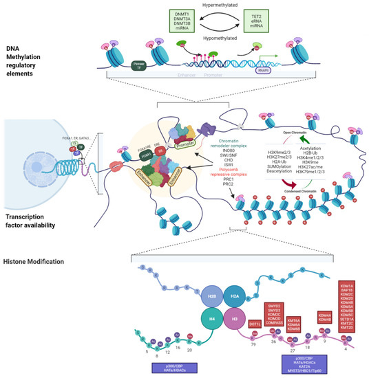 Advances in next-generation sequencing (NGS) technologies have revealed the critical roles of epigenetic factors in luminal breast cancer development and hormonal therapy resistance. Epigenetic dysregulation is frequently observed in the regulation of tumor suppressor genes and/or oncogenes in cancer cells [78]. Aberrant regulation of factors involved in ER signaling may promote breast cancer tumorigenesis. Thus, these factors are potential diagnostic biomarkers for breast cancer. Genomic instability is mediated by aberrant DNA methylation and histone modifications, which are associated with the prognosis of ER+ breast cancer subtypes [19,24,79]. Epigenetic factors are classified into writers, readers, and erasers and include DNA methyltransferases (DNMTs), ten-eleven translocation enzymes (TET), HATs, HDACs, HMTs, histone demethylases, and other factors, such as miRNAs, lncRNAs, and eRNAs [80,81,82]. Aberrant epigenetic functions are mechanically linked to epigenetic reprogramming during the formation of heterogeneous tumors and the adaptation to therapeutics. Some epigenetic factors involved in DNA methylation and histone modification are upregulated in ER+ breast cancer and are suggested to be diagnostic biomarkers for ER+ breast carcinogenesis, oncogenic reprogramming, and endocrine therapy resistance [69,83].