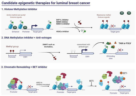 Although hormonal therapy is highly efficacious, alternative therapeutic approaches for ER+ breast cancer subtypes must be explored as the cancer cells exhibit endocrine therapy resistance and epigenomic reprogramming. In contrast to genetic alterations, epigenetic alterations are dynamic and reversible. Therefore, current hormonal therapy can be further improved to overcome therapy resistance. Premenopausal patients with luminal breast cancer are eligible for endocrine therapy, which markedly decreases tumor size. Tamoxifen and fulvestrant, which are well-known anti-estrogen agents, exhibit potent antitumor efficacy in premenopausal patients. In the post-menopausal stage, E2 production is regulated by aromatase in the extra-ovarian tissues instead of the ovary in which E2 is no longer synthesized [202]. The efficacy of AIs is higher than that of ER antagonists in post-menopausal patients with luminal breast cancer. Letrozole, anastrozole, and exemestane, which are AIs that competitively bind to aromatase, have been successfully used for the clinical treatment of hormone-positive and HER2-negative breast cancers [203]. Epi-drugs alone or in combination with endocrine drugs have been considered for ER+ breast cancer treatment to mitigate endocrine therapy resistance.