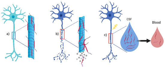 Tau, a protein belonging to the family of microtubule associated proteins (MAPs), is involved in cellular structure and localized primarily on a neuron’s axonal tracts and, at lower levels, in glia, either oligodendrocytes or astrocytes (Figure 1a) [2]. We can account for several physiological functions for the Tau protein, mainly including microtubular assembly and axonal stabilization; Tau may also support synaptic plasticity [3]. However, the exact mechanism of microtubule stabilization and assembly remains demanding to evaluate [4]. The alternative splicing of the microtubule associated protein Tau (MAPT) gene is responsible for six different isoforms of the Tau protein [4]. Tau function also depend on phosphorylation, which decreases Tau affinity in the microtubules, ensuring a balance between assembly and disassembly in healthy neurons. However, hyper-phosphorylation may occur in neurodegenerative disease, leading to an evident neuronal loss (Figure 1b) [4]. Furthermore, upon neuronal disruption from any physiological or pathological injury, t-Tau and p-Tau can be released in the extracellular milieu and CSF (Figure 1c). Therefore, Tau can be detected in the CSF of healthy subjects as a reflection of physiological aging with different values depending on the individual’s age, but, more importantly, as a marker of central nervous system (CNS) pathology in patients with neurodegenerative diseases [5,6], representing a biomarker of axonal loss in several neurological conditions. Tau probably experiences a spontaneous clearance from the CSF to serum [7]. Thus, in the same individual, its concentrations will be higher in CSF than in serum or plasma [8] (Figure 1c).