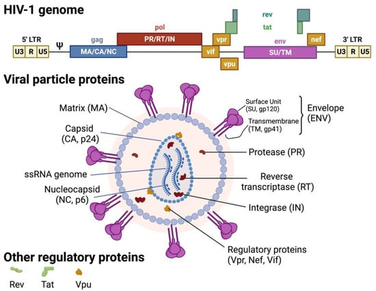 HIV-1 genome and virion structure. Created with BioRender.com (accessed on 28 January 2022).