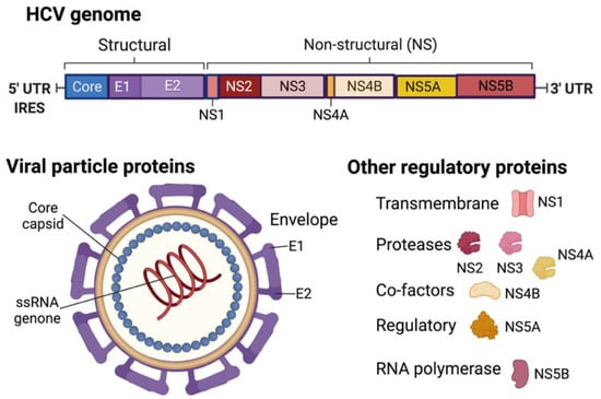 HCV genome and virion structure. Created with BioRender.com (accessed on 28 January 2022).