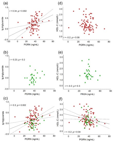 We did not find significant correlations between serum oxLDL and PGRN in HeFH patients (r = 0.19; p = 0.11) or in the whole study population (r = 0.13; p = 0.20); however, there was a significant correlation in the control subjects (r = 0.45; p < 0.05).