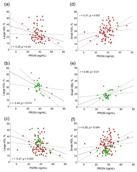 The correlations between the ratio of large HDL subfractions and serum progranulin (PGRN) in heterozygous familial hypercholesterolemic (HeFH) patients (a), healthy controls (b) and the whole study population (c). The correlations between the ratio of small HDL subfractions and serum progranulin (PGRN) in heterozygous familial hypercholesterolemic (HeFH) patients (d), healthy controls (e) and the whole study population (f).
