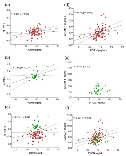 - Yao, S.; Luo, N.; Liu, J.; Zha, H.; Ai, Y.; Luo, J.; Shi, S.; Wu, K. Elevated Serum Levels of Progranulin and Soluble Vascular Cell Adhesion Molecule-1 in Patients with COVID-19. J. Inflamm. Res. 2021, 14, 4785–4794. [Google Scholar] [CrossRef]