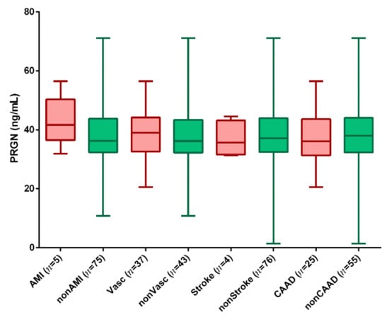 Slightly, but not significantly, higher PGRN concentrations were found in patients with a positive history of acute myocardial infarction (AMI) (n = 5, mean age at first AMI: 53.8 ± 5.9 years) compared to patients without AMI (n = 75) (43.07 vs. 37.46 ng/mL, p = 0.06) (Figure 4). There were no differences in PGRN between patients with and without vascular complications, stroke and CAAD in their history (Figure 4).