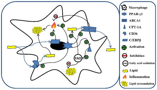 Numerous are the potential mechanisms implicated in lipid accumulation. Among them, peroxisome proliferator-activated receptor gamma (PPAR-γ) represents the main regulator of fatty acids storage and mobilization of lipids. However, PPAR-γ interacts with other proteins involved in lipid metabolism (Figure 1). For example, the cluster of differentiation 36 (CD36) [], devoted to the uptake of lipids, ox-LDL, and their accumulation []; CCAAT enhancer-binding protein beta (C/EBPβ), which regulates the progression of foam cell formation and the inflammatory response induced by lipid accumulation []; carnitine palmitoyltransferase 1A (CPT-1A) [], involved in FA oxidation (FAO) []; ATP-binding cassette transporter 1 (ABCA1) [], devoted to maintaining cellular cholesterol homeostasis and preventing foam cell formation through the removal of cellular lipids [,]. In addition, ABCA1 has been recognized to exert an anti-inflammatory activity [].