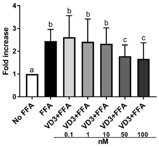 Effect of different concentrations (0.1–100 nM) of VD3 on cell lipid accumulation. Data are reported as a fold increase and mean ± standard deviation. a,b,c Bar graphs with different letters are significantly different (p ≤ 0.01). No FFA: no free fatty acids (control); FFA: free fatty acids (500 μM); VD3: calcitriol + free fatty acids (500 μM).