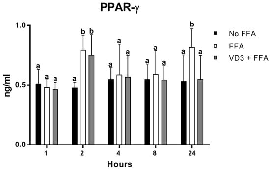Effect of VD3 supplementation on PPAR-γ1 protein levels. Data are reported as mean ± standard deviation. a,b Bar graphs with different letters are significantly different (p ≤ 0.01). No FFA: no free fatty acids (control); FFA: free fatty acids (500 µM); VD3: calcitriol (50 nM).