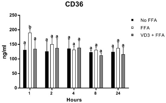 Effect of VD3 supplementation on CD36 protein levels. Data are reported as mean ± standard deviation. a,b Bar graphs with different letters are significantly different (p ≤ 0.01). No FFA: no free fatty acids (control); FFA: free fatty acids (500 µM); VD3: calcitriol (50 nM).