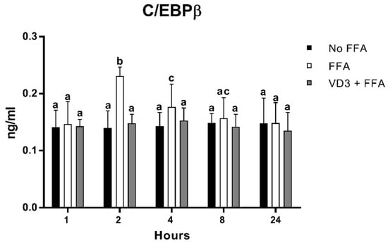 Effect of VD3 supplementation on C/EBPβ cell protein levels. Data are reported as mean ± standard deviation. a,b,c Bar graphs with different letters are significantly different (p ≤ 0.01). No FFA: no free fatty acids (control); FFA: free fatty acids (500 µM); VD3: calcitriol (50 nM).