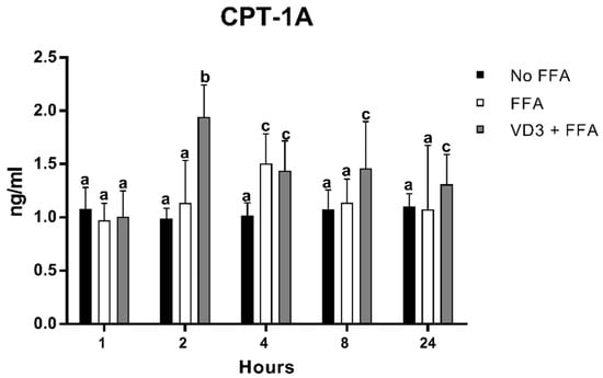 The intracellular concentration of FAs brings an overexpression of not only PPAR-γ but also of other genes involved in the lipid metabolism, including those related to the inflammatory response, such as C/EBPβ, and the beta-oxidation, such as CPT-1A, as documented by their temporary upregulation (at 2 and 4 h for C/EBPβ and at 4 h for CPT-1A). The incubation of VD3 with FFA blunted the overexpression of C/EBPβ, while it maintained upregulated CPT-1A from 2 h up to 24 h compared to control, suggesting that VD3 stimulates the lipid metabolism by reducing intracellular lipid accumulation and increasing the oxidation process; meanwhile, VD3 was also able to blunt the inflammatory response at the levels of macrophages. To the best of our knowledge, the role of VD3 on C/EBPβ and CPT-1A has been poorly investigated, in particular at the levels of macrophages, but the results seem to be in line with our observations [,,,]. Specifically, Blumberg et al. [] reported that the treatment with VD3 (1–100 nM) in the preadipocytes 3T3-L1 cell line reduced the expression of C/EBPβ and upregulated the C/EBPβ corepressor, determining the blocks of adipogenesis and the reduction of lipid accumulation. Chang and colleagues [] showed significantly higher levels of CPT-1 in muscle cells treated with VD3 (100 nM; 24 h). Scrimieri and coworkers [] observed an upregulation of CPT-1A induced by VD3 (20 nM) in endothelial cells incubated with a high-glucose concentration (30 mM d-glucose for 24 h). The effect of VD3 on CPT-1A has also been investigated in animal models, showing similar findings following the co-administration of a high-fat/high-sugar diet and VD3 [,].
