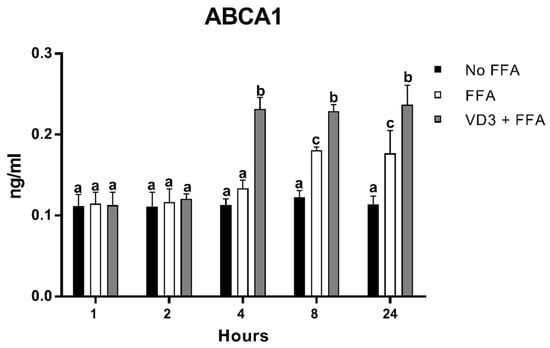 Effect of VD3 supplementation on ABCA1 protein levels. Data are reported as mean ± standard deviation. a,b,c Bar graphs with different letters are significantly different (p ≤ 0.01). No FFA: no free fatty acids (control); FFA: free fatty acids (500 µM); VD3: calcitriol (50 nM).