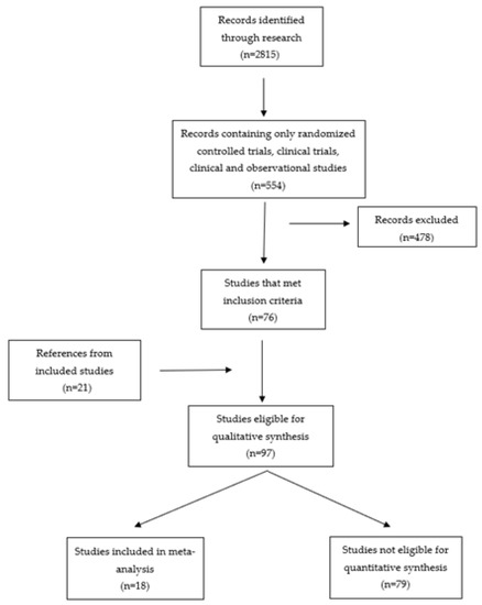 This study was based on the PRISMA statement (Figure 1). The electronic database of PubMed was searched from January 2008 to May 2021. The search terms were “type 2 diabetes mellitus” OR “diabetes” OR “vascular risk factor” OR “metabolic syndrome” AND “dementia” OR “Alzheimer disease” OR “p-tau” OR “b-amyloid”. There were 12,815 results, but by focusing on randomized controlled and clinical trials, as well as clinical and observational studies, there were 554 results. Initially, all the articles were screened according to their title and abstract, and some of them, which were not potentially relevant, were excluded (478). Additional relevant articles and reviews were retrieved for methodological issues and underlying mechanisms that were eligible for our qualitative synthesis (97).