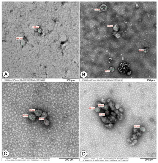 The nanoparticle tracking analysis (NTA), i.e., the determination of the size and concentration of plasma-derived isolated exosomes, was performed using a NanoSight LM10 (Malvern Panalytical Ltd., Malvern, UK) equipped with a 450 nm laser, carried out according to the manufacturer’s protocols. The samples were diluted 1:200 in sterile 0.9% NaCl. Each experiment was repeated three times (each for a total capture time of 60 s with a frame rate of 25 frames/s and a camera level of 11). The cumulative percentage of nanoparticles was calculated using the nanoparticle size distribution curve, refractive index, and relative nanoparticle concentration of a certain size for each sample. The data was processed using NTA 3.0 software with a detection threshold of 4 at a temperature control of 25 °C.