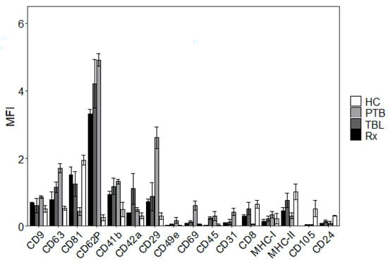 Our study characterizes the size, concentration, and surface marker signatures of exosomes isolated from the plasma of TB patients and extends the knowledge about the lipid and protein composition of human blood plasma-derived exosomes. In the present study, exosomes isolated from the plasma of healthy individuals and active TB patients (TBL, treated and untreated PTB) were demonstrated to have a size range of 30 to 150 nm [10,32,33]. The characteristic proteins CD9, CD63, and CD81 were all expressed on exosomes from active TB patients [9,34,35]. In addition, proteomics characterization confirmed the identity of exosomes from patient-derived plasma by identifying exosomal markers CD9, CD151, and LGALS3BP [36]. In summary, NTA, TEM, flow cytometry, and proteomics surface marker analysis confirmed the presence of an exosomal population, as all findings correspond to characteristics reported elsewhere. However, the co-isolation of other blood-derived particles, e.g., lipoproteins, immune complexes, or proteins of the complement system from patients’ plasma can be anticipated. This is in line with other reports of plasma-derived exosomes, regardless of the applied method of exosome isolation [37,38]. To the best of our knowledge, no gold-standard method that combines absolute purity of exosome extractions and feasibility in clinical settings has been previously established.