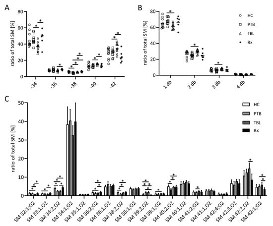 Composition of the sphingomyelin (SM) fraction of exosomes from TB patients. Organic extracts of exosome-derived lipids isolated from patients with pulmonary tuberculosis (PTB) and tuberculous lymphadenitis (TBL) as well as PTB-treated patients (Rx) were separated by high-performance thin layer chromatography. SM-containing spots were automatically eluted with methanol and directly analyzed by ESI-IT MS. The sum of SM species with up to 34, 36, 38, 40 and 42 C atoms (A) and the sum of SM species with one, two, three and four double bonds (db) (B) as well as the relative amounts of single SM species (C) were calculated from the sum of the signal intensities of all SM. Data sets in panels (A,B) are depicted as dot plots to show all single values, whereas data sets in panel (C) are depicted as bar graphs showing the mean and the positive standard deviation. Statistical significance was determined using the unpaired t test and the Holm–Sidak method to correct for multiple comparisons (alpha = 0.05). * p < 0.05.