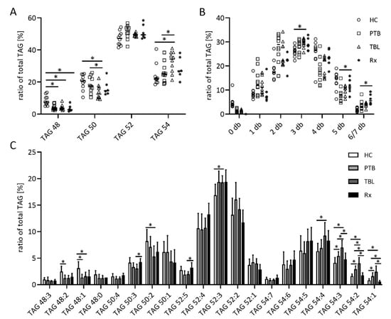The TAG fractions of all samples contained about 18 to 20% TAG 52:3 as the main TAG. TAGs in HC were shorter compared to patient samples, represented by higher amounts of TAG 48:1, TAG 48:2 and TAG 50:2, and lower amounts of TAGs with 54 C atoms. PTB and TBL patients differed significantly in regards to the concentration of TAG with 50 and 54 C atoms in their fatty acyl chains (Figure 5A). The latter was due to higher amounts of TAG 54:3, TAG 54:2 and TAG 54:1 (Figure 5C). The treatment of PTB patients caused an increase in the double bond content of TAG molecules (Figure 5B).