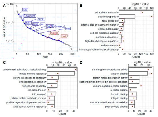 Identification of exosomal proteins by mass spectrometry-based proteomics. (A) Proteins were isolated from circulating exosomes, proteolytically cleaved, and analyzed via mass spectrometry-based proteomics. Proteins were identified by MaxQuant (version 1.6.3.3). Protein abundances were estimated by the included MaxLFQ algorithm. Based on label-free quantification (LFQ), isolated proteins span about five orders of magnitude of abundance and include common populations of frequently observed vesicular proteins (blue) and proteins of M. tuberculosis origin (red). Identified proteins were used for gene ontology (GO) overrepresentation analysis, including the categories “cellular components” (B), “biological processes” (C), and “molecular functions” (D). Representative terms are illustrated by the number of included proteins (bars) and the significance of overrepresentation (as-log10 p value, red diamonds).