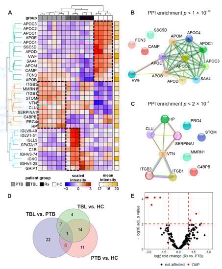 The first main branch comprises proteins that are more abundant in HC and depleted in Mtb-infected patients regardless of the disease or treatment state. This includes the antibacterial proteins Cationic Antimicrobial Protein (CAMP), Ficolin 3 (FCN3), and Scavenger Receptor Cysteine Rich Family Member (SSC5D), as well as eight apolipoproteins. The latter are forming a significant functional network (Figure 7B). The second main branch comprises proteins that are more abundant in PTB-derived samples, including integrins (ITGB1, ITGB3), the cell adhesion factor Vitronectin (VTN), the extracellular chaperone Clusterin (CLU), Alpha-1-antitrypsin (SERPINA1), and Haptoglobin (HP), which are likewise significantly connected by functional relationships (Figure 7C). The third main branch comprises proteins that are more abundant in TBL-derived samples. This includes six immunoglobulins (IGs), a complement component (C1R), the Spermatogenesis-Associated Protein 17 (SPATA17), and the Glutamate receptor-interacting protein 1 (GRIP1).