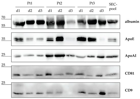 Both individual CSF samples and the resulting CSF-pool were screened for the presence of EVs, lipoproteins, and albumin by western blot analyses (Figure 1). The most abundantly detected protein in individual CSF samples was albumin, followed by lipoprotein markers ApoE and ApoAI, while EV markers CD81 and CD9 were detected at the lowest level. When patients were compared by protein kinetics, albumin was present at high levels all three days in all three patients, with only Patient 2 (Pt2) having a lower amount of albumin on day 3 (d3). Contrary to albumin, ApoE kinetics displayed a wider range in amounts between patients. Pt1 showed a moderate level of ApoE on day 1 and a lower level on days 2 and 3. However, Pt2 and Pt3 displayed moderate to high levels of ApoAI on d1 and d2, but a hardly detectable level on d3. ApoAI has been detected at low to moderate levels in all nine CSF samples. EV markers CD81 and CD9 showed mostly comparable levels among all 3 patients during the monitored 3 days, with the only exception of d3 for Pt2, when CD9 was not detected. Finally, the CSF-pool comprising all nine CSF samples contained the analysed proteins at detectable levels, indicating that the starting CSF-pool for SEC included free proteins, lipoproteins, and EVs.