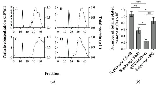 - Böing, A.N.; van der Pol, E.; Grootemaat, A.E.; Coumans, F.A.W.; Sturk, A.; Nieuwland, R. Single-Step Isolation of Extracellular Vesicles by Size-Exclusion Chromatography. J. Extracell. Vesicles 2014, 3, 23430. [Google Scholar] [CrossRef]