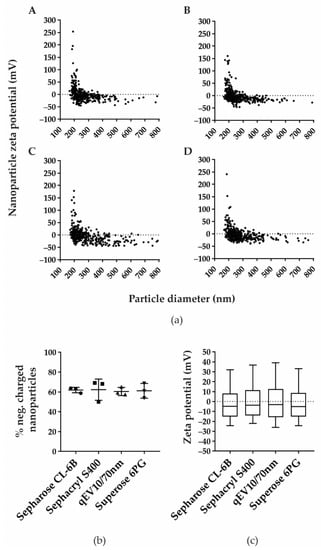 Zeta potential and percentage of negatively charged isolated nanoparticles are comparable in all four SEC methods. (a) Zeta potential was measured in TRPS positive fractions after separation by Sepharose CL-6B (A), Sephacryl S-400 (B), qEV10/70 nm (C), and Superose 6PG (D). Shown are representative distributions of nanoparticle zeta potential measured in millivolts (mV) and nanoparticle diameter measured in nanometres (nm). (b) Percentage of negatively charged nanoparticles are shown as mean values with their standard deviation from three experiments for each SEC method. (c) Measured zeta potentials are presented as median values and interquartile ranges (boxes) coupled with 10–90 percentile ranges (whiskers).