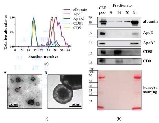 To provide a better overview of the protein levels in individual fractions obtained with Sepharose CL-6B, we quantified the signals immunodetected on slot blot and plotted them on one graph (Figure 4a). All continuous ranges of positive fractions formed curves, which were narrow and symmetrical in the cases of CD81, CD9, ApoAI, and ApoE, and wider and less smooth in the case of albumin. Moreover, complete overlapping was observed for CD81 and CD9 curves as well as for ApoAI and ApoE curves. The albumin curve overlapped with the second part of both the ApoAI and ApoE curves. To confirm the specificity of immunodetection after slot blot of SEC-fractions, we also studied proteins of selected fractions by electrophoresis, followed by western blot analyses (Figure 4b). We chose fractions 9, 14, and 20 to represent SEC before, amid, and after nanoparticle-positive peak and fraction 34 to represent the free-protein peak (Figure 4a). After Ponceau staining, we observed no signal in fractions no. 9, 14, and 20, but we detected abundant proteins of roughly 70 kDa and less than 15 kDa in size, as well as low levels of proteins around 35 kDa and 100 kDa, in both fraction no. 34 and the CSF-pool used for the SEC separation. In the western blot analyses of the same fractions, we noticed signals of the expected size for every analysed protein. We detected CD81 and CD9 in fraction 14, but not in fraction 34, whereas the opposite was true for ApoAI and ApoE: we observed them in fraction 34, but not in fraction 14. Interestingly, the ratio of the CD81 and CD9 signals in the nanoparticle-enriched fractions differed from the ratio in the initial CSF-pool. To further confirm the presence of EVs in fraction 14, we performed electron microscopy analyses (Figure 4c). We detected round shaped extracellular vesicles measuring 100–130 nm in diameter.