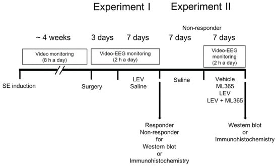 Baseline seizure activity in chronically epileptic rats were recorded over a 3-day period. Electroencephalographic (EEG) signals were acquired with a DAM 80 differential amplifier (0.1–1000 Hz bandpass; World Precision Instruments, Sarasota, FL, USA) 2 h a day at the same time over a 7-day period. Thereafter, animals received LEV (500 mg/kg, i.p., UCB Korea, Seoul, Korea) or saline (vehicle) once a day (at 6:00 p.m.) over a 7-day period [,,]. The EEG data were digitized and analyzed using a LabChart Pro v7 (ADInstruments, Bella Vista, New South Wales, Australia). Racine’s scale was applied to quantify behavioral seizure severity, as aforementioned. Animals whose seizure frequency was unaffected by LEV during recording, as compared to the pre-treatment stage, were defined as non-responders (Figure 1).
