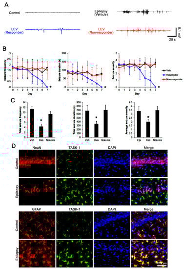 The effects of levetiracetam (LEV) on spontaneous seizure activities in chronically epileptic rats and the localization TASK-1 in the hippocampus of the control and chronically epileptic rats. LEV effectively attenuated spontaneous seizure activity on EEG in responders (A) at 4 days after treatment, accompanied by reductions in seizure frequency (Friedman test), seizure duration (repeated measures ANOVA), seizure severity (seizure score, Friedman test), total seizure frequency (Mann–Whitney U test), total seizure duration (Student’s t-test) and average behavioral seizure score (seizure severity; Mann–Whitney U test) over a 7-day period (B,C; *, p < 0.05 vs. vehicle (Veh)-treated animals; error bars, SD). However, the non-responders did not respond to LEV treatment (B,C). Double immunofluorescent data reveal that TASK-1 expression is observed in GFAP-positive astrocytes, but not in NeuN-positive neurons in both control and chronically epileptic rats (D).