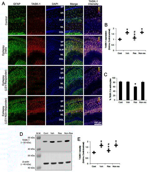 Consistent with previous studies [,,], TASK-1 expression was rarely observed in CA1 neurons in both control and epileptic rats (Figure 2D). In contrast, TASK-1 expression was prominently detected in the astrocytes within the stratum radiatum and stratum lacunosum-moleculare of the CA1 region of the control rats (n = 7). TASK-1 expression was also detected in the astrocytes in the molecular layer and the hilus of the dentate gyrus of control rats (Figure 2D and Figure 3A). In chronically epileptic rats (n = 7), TASK-1 expression was obviously detected in most of the reactive CA1 astrocytes, showing hypertrophy and hyperplasia of cell bodies and processes (Figure 2D). TASK-1 expression was rarely observed in reactive astrocytes within the dentate gyrus (Figure 3A). TASK-1 fluorescent intensity was increased to 1.62-fold of control level (t(12) = 14.4, p < 0.001, Student’s t-test, Figure 3A,B). However, the fraction of TASK-1 positive astrocytes in total astrocytes of chronically epileptic rats was similar to that in control animals (Figure 3C). As compared to the vehicle-treated animals (n = 7), responders to LEV (n = 7) showed a reduction in TASK-1 fluorescent intensity (F(2,17) = 49.7, p < 0.001, one-way ANOVA), while the TASK-1 intensity in non-responders to LEV (n = 6) was unaffected by LEV treatment (Figure 3A,B). Thus, the fraction of TASK-1 positive astrocytes in total astrocytes was decreased in responders, as compared to the vehicle-treated animals (F(2,17) = 5.4, p = 0.015, one-way ANOVA, Figure 3C). Compatible with the immunohistochemical data, the Western blot revealed that TASK-1 density was elevated to 1.65-fold of control level in chronically epileptic rats (t(12) = 11.9, p < 0.001, n = 7, Student’s t-test, Figure 3C,D). In responders (n = 7), LEV reduced TASK-1 density in the hippocampus (F(2,17) = 37.1, p < 0.001, one-way ANOVA) but not in the non-responders (n = 6 Figure 3C,D, Supplementary Figure S1). Together with the effects of LEV on seizure activity, these findings indicate that the upregulated TASK-1 expression in CA1 astrocytes may be relevant to spontaneous seizure activity and affect the responsiveness to LEV.