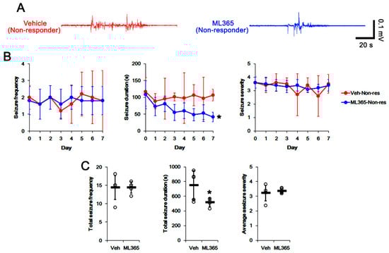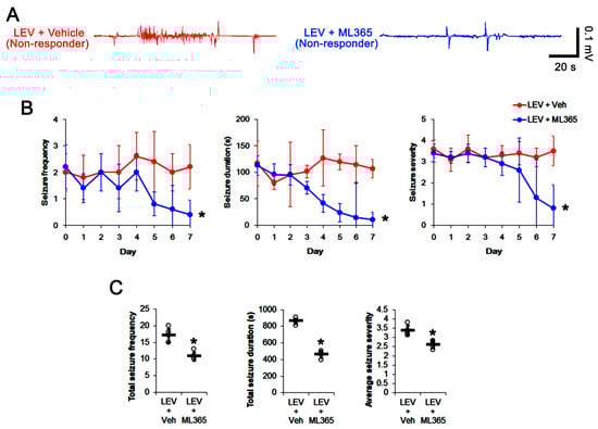 The effect of ML365 co-treatment with levetiracetam (LEV) on spontaneous seizure activities in non-responders to LEV. ML365 co-treatment improved the efficacy of LEV in non-responders. (A) Representative EEG signal in each group at 4 days after treatment. (B) Quantitative analyses of the effects of ML365 co-treatment on seizure frequency (Friedman test), seizure duration (repeated measures ANOVA) and seizure severity (seizure score, Friedman test) over a 7-day period (*, p < 0.05 vs. vehicle (Veh)-treated animals; error bars, SD). (C) Quantitative analyses of total seizure frequency (Mann–Whitney U test), total seizure duration (Student’s t-test) and average behavioral seizure score (seizure severity, Mann–Whitney U test) over a 7-day period (*, p < 0.05 vs. vehicle (Veh)-treated animals; open circles, each individual value; horizontal bars, mean value; error bars, SD).