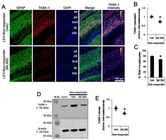 The effect of ML365 on TASK-1 expression in non-responders to levetiracetam (LEV). As compared to the vehicle (Veh), ML365 reduces TASK-1 expression in CA1 astrocytes within the hippocampus of non-responders. (A) Representative photos of TASK-1 expression in the hippocampus (SP, stratum pyramidale; SR, stratum radiatum; SLM, stratum lacunosum-moleculare; ML, molecular layer of the dentate gyrus; DGL, dentate granule cell layer). (B) Quantitative analyses of the effect of ML365 on TASK-1 expression based on immunohistochemical data. Open circles indicate each individual value. Horizontal bars indicate the mean value. Error bars indicate SEM (*, p < 0.05 vs. vehicle-treated animals; Student’s t-test). (C) Quantitative analyses of the effect of ML365 on the fraction of TASK-1 positive astrocytes in total astrocytes (*, p < 0.05 vs. control animals; Student’s t-test; error bars, SEM). (D) Representative images for Western blot of TASK-1 protein expression in the hippocampal tissues. (E) Quantification of TASK-1 levels based on Western blots (*, p < 0.05 vs. vehicle-treated animals; Student’s t-test).