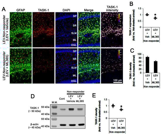 To directly investigate the role of TASK-1 in spontaneous seizure activity, we applied ML365 (a selective TASK-1 inhibitor) to non-responders to LEV. In vehicle-treated non-responders to LEV (n = 10), the total seizure frequency, total EEG seizure duration and average seizure severity over a 7-day period were 14.4 ± 3.3, 751 ± 197 s, and 3.2 ± 0.5, respectively (Figure 4A–C). In ML365-treated non-responders to LEV (n = 10), seizure duration was gradually decreased over a 7-day period (F(7,63) = 3.326, p = 0.004, repeated measures ANOVA; Figure 4A,B). In this group, the total seizure duration was also diminished to 519 ± 55 s over a 7-day period (t(8) = 2.5, p = 0.035 vs. vehicle, Student’s t-test; Figure 4C). Furthermore, ML365 reduced the TASK-1 fluorescent intensity to 0.73-fold of the vehicle levels (t(8) = 8.8, p < 0.001 vs. vehicle, Student’s t-test, n = 5). In addition, ML365 diminished the fraction of TASK-1 positive astrocytes of the total astrocytes (t(8) = 2.7, p = 0.027, Student’s t-test, Figure 5C). Consistent with the immunohistochemical study, the Western blot data showed a reduction in TASK-1 density to 0.71-fold of the vehicle levels (t(8) = 6.4, p < 0.001 vs. vehicle, Student’s t-test, n = 5) in ML365-treated non-responders (Figure 5D,E, Supplementary Figure S1). These findings indicate that TASK-1 in reactive CA1 astrocytes may be involved in the prolongation of seizure duration rather than seizure generation (ictogenesis) in non-responders to LEV.