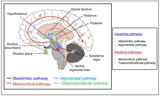 The main dopaminergic pathways within the brain consist of projections from dopaminergic cell bodies located at the level of the substantia nigra, the ventral tegmental area and the arcuate nucleus of the hypothalamus; dopaminergic projections depart from these hubs which give life to the nigrostriatal, mesolimbic, mesocortical and tuberoinfundibular pathways [12] (Figure 1).