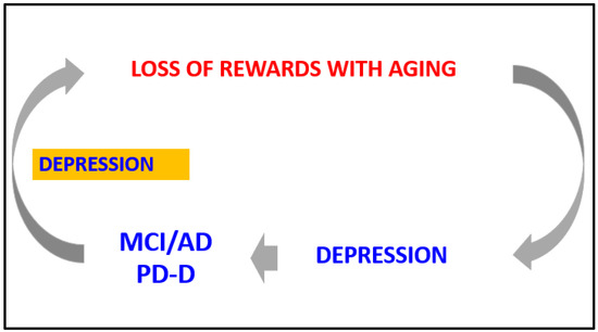 Hypothetical loop explaining the potential link between age-related changes in rewards system, depression, Mild Cognitive Impairment (MCI), Alzheimer’s Disease (AD) and Parkinson’s Disease (PD) Dementia.