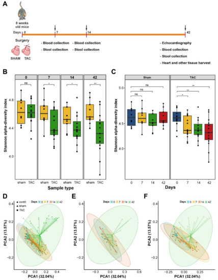 Diversity differences between Sham and TAC sample types. (A) Pictorial representation of the study plan. (B) Box plots for the Shannon alpha-diversity index in Sham and TAC samples at different time points. The box plot boxes indicate interquartile ranges (IQR), the black line indicates the median, whiskers extend till extreme values within 1.5 times the IQR, and black points outside whiskers are outliers. For the 1st- and 6th-week samples, Shannon index values with significant differences in the Sham and TAC samples are shown (*, **, and ns correspond to p ≤ 0.05, p ≤ 0.01, and not significant, respectively). (n values are as follows: Sham day 0 = 10, day 7 = 10, day 14 = 9, day 42 = 9; TAC day 0 = 16, day 7 = 16, day 14 = 16, day 42 = 15). (C) Box plots for the Shannon alpha-diversity index within sample type (Sham and TAC) at different time points. Observed significant differences for each timepoint sample comparison with the 0th-day TAC samples. (n values are as follows: Sham day 0 = 10, day 7 = 10, day 14 = 9, day 42 = 9; TAC day 0 = 16, day 7 = 16, day 14 = 16, day 42 = 15). (D) For different time points, separate clusters were observed in the PCoA plot for all sample types. For the 6th-week samples, distinct clusters were observed for the control, Sham, and TAC sample types (PERMANOVA p-value: 0.001, beta dispersion p-value: 1 × 10−4). (n values are as follows: control day 0 = 12, day 7 = 12, day 14 = 12, day 42 = 12; Sham day 0 = 10, day 7 = 10, day 14 = 9, day 42 = 9; TAC day 0 = 16, day 7 = 16, day 14 = 16, day 42 = 15). (E) PCoA plot of Sham samples at different time points. The 6th-week samples formed a separate cluster compared to other timepoint samples for the Sham sample type. (PERMANOVA p-value: 0.377, beta dispersion p-value: 0.3875) (n values are as follows: day 0 = 10, day 7 = 10, day 14 = 9, day 42 = 9). (F) PCoA analysis of TAC samples at different time points. The 6th-week samples formed a distinct cluster as compared to other time point data of TAC samples with large variations. (PERMANOVA p-value: 0.001, beta dispersion p-value: 1 × 10−4) (n values are as follows: day 0 = 16, day 7 = 16, day 14 = 16, day 42 = 15).