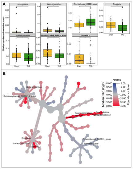 Comparative analysis of gut microbial content in Sham Vs. TAC mice. (A) Box plot showing relative abundances of the total of 7 genera that were found to be differentially abundant using Wilcoxon’s test in the Sham and TAC comparison, indicating that most of the genera were found to be more abundant in Sham samples as compared to TAC samples (*, **, and *** correspond to p ≤ 0.05, p ≤ 0.01, and p ≤ 0.001, respectively). (n values are as follows: Sham = 38, TAC = 63). (B) Heat-tree showing significantly different genera in the Sham and TAC comparison using Wilcoxon’s test (p-value ≤ 0.05). (n values are as follows: Sham = 38, TAC = 63).