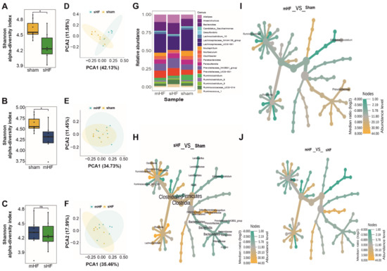 Diversity and microbial compositional differences in the mHF, sHF, and Sham samples. (A) Box plot for Shannon diversity index showing a significant difference in sHF vs. Sham samples (p-value = 0.038). (B) Box plot for the Shannon alpha-diversity index showing significant differences in the mHF and Sham samples (p-value = 0.039). (C) Box plot for the Shannon alpha-diversity index for the mHF and sHF samples showing no significant differences in samples. (D) PCoA plot with separate clustering in the sHF and Sham samples (PERMANOVA p-value: 0.258, beta dispersion p-value: 0.2498). (E) PCoA analysis of the mHF and Sham samples with no distinct cluster formation (PERMANOVA p-value: 0.411, beta dispersion p-value: 0.3976). (F) PCoA analysis results of the sHF and mHF samples showing no significant differences (PERMANOVA p-value: 0.733, beta dispersion p-value: 0.7322). (G) Top twenty genera relative abundances in the mHF, sHF, and Sham sample types. (H) Heat-tree showing 13 differentially abundant taxa in the sHF vs. Sham comparison using Wilcoxon’s test. (I) Heat-tree for significantly abundant taxa between the mHF and Sham samples comparison using Wilcoxon’s test. (J) Heat-tree showing no significant differences in the mHF and sHF samples using Wilcoxon’s test. (n values for 3F–3J are as follows: Sham = 9, mHF = 7, sHF = 6). * and ns correspond to p ≤ 0.05, non-significant, respectively.