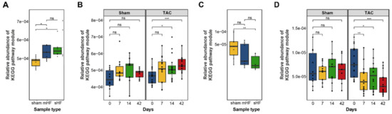 All the results are presented as box plots with a minimum-to-maximum range or bar graphs (showing all points) unless specified otherwise. Statistical significance within sample types (control, Sham, and TAC) for bacterial composition analysis was tested using non-parametric Wilcoxon’s test and the significant grouping in samples was assessed using permutational multivariate analysis of variance (PERMANOVA). To identify the difference in microbial abundances between the two groups, Wilcoxon’s test was performed, and the p-values were adjusted using the false discovery rate (FDR) method. Mice echocardiography data were analyzed using one-way analysis of variance (ANOVA, followed by the Student–Newman–Keuls post hoc test), whereas statistical analysis using the Kruskal–Wallis test was used to identify differentially abundant KEGG modules within different sample types. The p-values ≤ 0.05 were considered statistically significant.