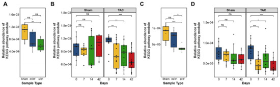 Box plot showing differences in the abundances of modules involved in butanoate and propanoate biosynthesis. (A) Differences in the abundances of genes involved in butanoate biosynthesis are shown for the sHF, mHF, and Sham samples. (n values are as follows: Sham = 9, mHF = 7, sHF = 6). (B) Genes involved in butanoate metabolism in the Sham and TAC samples at different time points indicating a significant decrease in gene concentrations in TAC samples with time. (n values are as follows: Sham day 0 = 10, day 7 = 10, day 14 = 9, day 42 = 9; TAC day 0 = 16, day 7 = 16, day 14 = 16, day 42 = 15). (C) Differences in the abundance of genes involved in propanoate biosynthesis are shown for the sHF, mHF, and Sham samples. (n values are as follows: Sham = 9, mHF = 7, sHF = 6). (D) Abundances of genes in propanoate biosynthesis at different time points in the Sham and TAC samples showing a decrease in gene concentrations in both the Sham and TAC samples with respect to time. TAC samples showed a significant decrease (p-value ≤ 0.05) for different time point samples relative to the initial (0th day) samples. (n values are as follows: Sham day 0 = 10, day 7 = 10, day 14 = 9, day 42 = 9; TAC day 0 = 16, day 7 = 16, day 14 = 16, day 42 = 15). *, **, and *** correspond to p ≤ 0.05, p ≤ 0.01, and p ≤ 0.001, respectively; ns, non-significant.