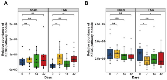 Box plot showing differences in the abundances of genes involved in the TMAO pathway in the Sham and TAC samples. (A) Differences in the abundances of the torZ gene are shown for the TAC and Sham samples. Significant differences in the torZ concentrations in TAC samples at the 1st and 6th weeks were found as compared to the initial TAC samples (0th week) using Wilcoxon’s test. (B) Differences in the abundances of the betaine/carnitine transporter involved in the TMAO pathway are shown for the TAC and Sham samples. The Wilcoxon’s test showed a significant decrease in gene concentration at the 1st and 6th weeks in the TAC samples. (n values are as follows: Sham day 0 = 10, day 7 = 10, day 14 = 9, day 42 = 9; TAC day 0 = 16, day 7 = 16, day 14 = 16, day 42 = 15). * and ** correspond to p ≤ 0.05, p ≤ 0.01 respectively; ns, non-significant.