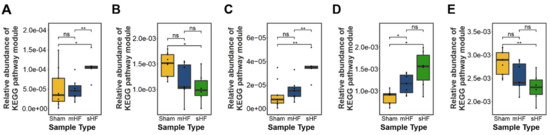 Box plots showing the differentially abundant KEGG pathway modules for amino acid metabolism. (A) Branched-chain amino acid degradation-related genes in the sHF, mHF, and Sham samples (Kruskal–Wallis test p-value = 0.001). (B) Aromatic amino acid metabolism in the sHF, mHF, and Sham samples (Kruskal–Wallis test p-value = 0.024). (C) Aromatic amino acid biosynthesis in the sHF, mHF, and Sham samples (p-value = 0.012). (D) Positively charged amino acid degradation in the sHF, mHF, and Sham samples (Kruskal–Wallis test p-value = 0.036). (E) Positively charged amino acid biosynthesis in the sHF, mHF, and Sham samples (Kruskal–Wallis test p-value = 0.018). (n values are as follows: Sham = 9, mHF = 7, sHF = 6). * and ** correspond to p ≤ 0.05, p ≤ 0.01 respectively; ns, non-significant.