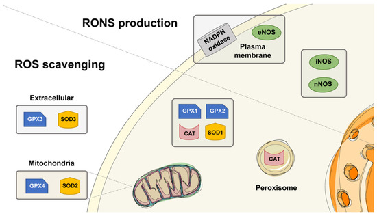 The dual action of reactive species in biological systems demands a fine control of the production and elimination of oxidants in the cells. The production of RONS by nitric oxide synthase and nicotinamide adenine dinucleotide phosphate (NADPH) oxidase is needed for normal physiological processes. Likewise, superoxide dismutase, catalase, and glutathione peroxidase are indispensable scavengers of RONS to preserve homeostasis. In this section, we describe the function of these enzymatic systems (Figure 1) in both normal and pathological conditions.