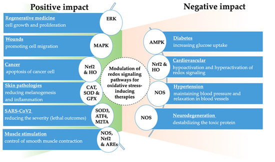 Oxidants can be derived from endogenous and exogenous sources (Table 3). These oxidants are continuously formed in the cells as a consequence of both enzymatic and non-enzymatic reactions. Endogenous free radicals formed during immune cell activation, inflammation, stress, excessive exercise, ischemia, infection, cancer, and aging are mainly produced via enzymatic reactions. Exogenous RONS can originate from industrial solvents, radiation, as well as from certain drugs used for medical treatments (cyclosporine, tacrolimus, gentamycin, bleomycin), etc. After penetration into the body by different routes, these exogenous compounds alter the normal redox status, which leads to disturbance of the cell signaling, further leading to activation or deactivation of signaling pathways [202,203]. There is a connection between the levels of oxidants in a cell and the activation of MAPK signaling. Especially, MAPKs are activated by H2O2 [204,205] led to the general recognition that RONS-signaling pathways have an important function in cell proliferation and growth (via extracellular signal-regulated kinase (ERK) mitogen-activated protein kinase (MAPK pathway) [95,206], and transcription factors. However, high levels of intracellular RONS, induced by the extracellular sources, are found to be controlling cancer by regulating the genes that are involved in metabolism, metastasis, and angiogenesis. There is also an intricate relationship between RONS and the immune system [207,208].