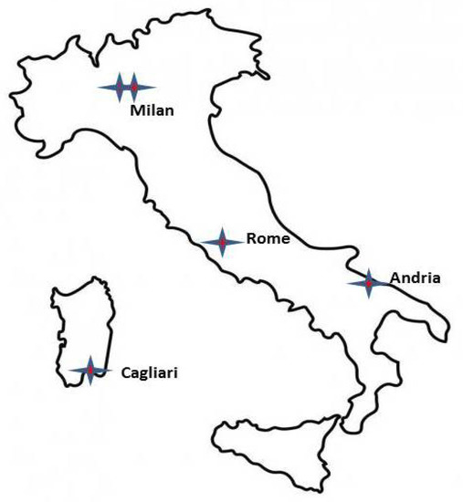 Map of Italy depicting the locations of the centers included in the study: two in the north of Italy (Milan), one in the center (Rome), one in the south (Andria), and one in Sardinia (Cagliari).